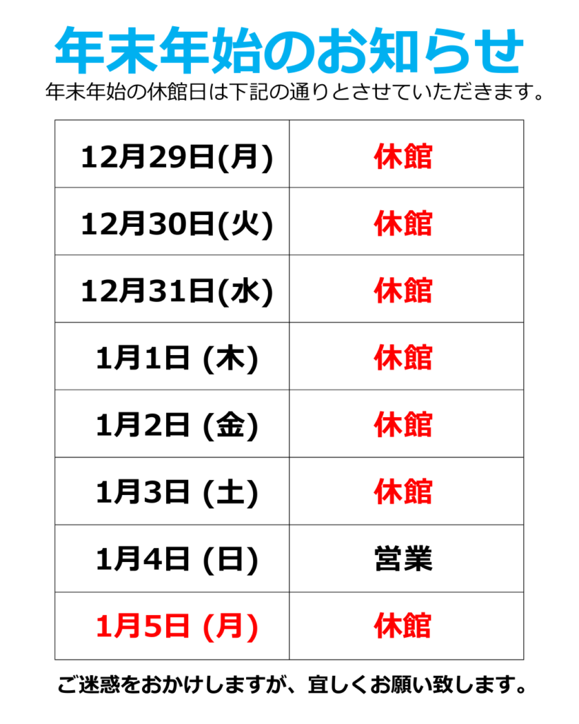 年末年始は休館とさせていただきます。新年は 1月4日(土)より営業開始 いたします。